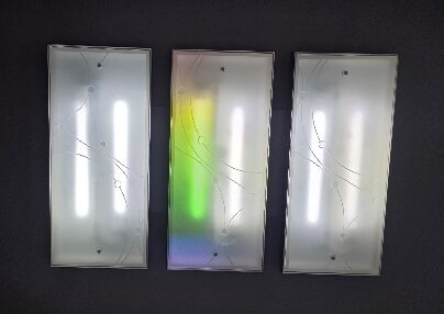 램프 열로 인하여 커버가 열화되어 깨짐 고정 리벳 제거 후 확산 pc 재단후 고정함